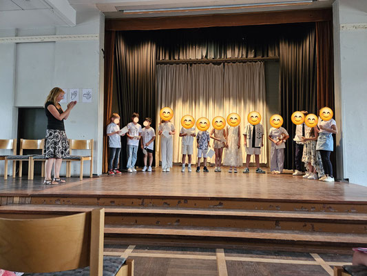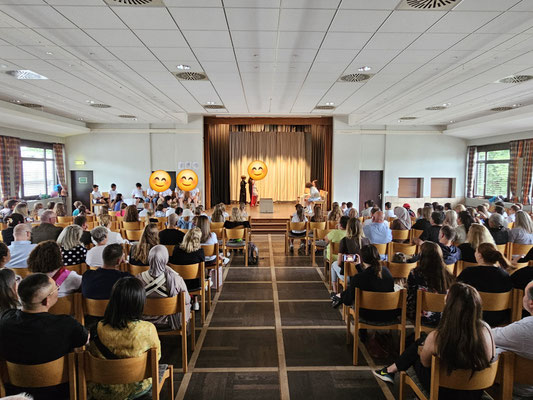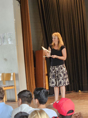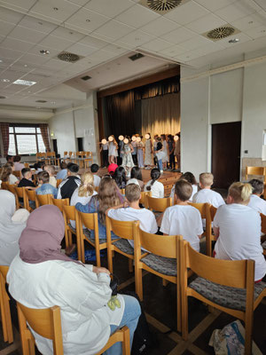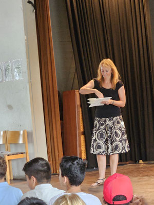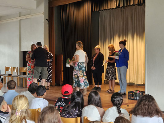 Frau Mathar führte durch das Programm der Abschiedsfeier. Dabei überreichte Sie den Siegern auch die Urkunden und Orden für die Bundesjugendspiele. Herzlichen Glückwunsch! Auch den Eltern wurde für die jahrelange Unterstützung gedankt. Frau Schelke, Herr Schmitz und Frau Calman wertschätzten die Mitarbeit mit einem kleinen Präsent.