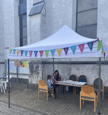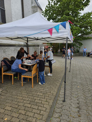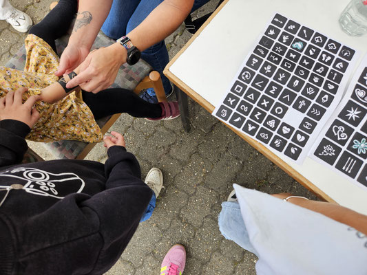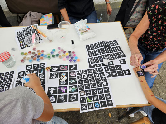 An unserem Stand konnten sich klein und groß ein Glitzertattoo auf die Haut kleben lassen. Egal ob Blume, Elefant oder Diamant. Für jeden Geschmack war etwas dabei. Eine wortwörtlich glitzernde Erinnerung an das diesjährige Pfarrfest.